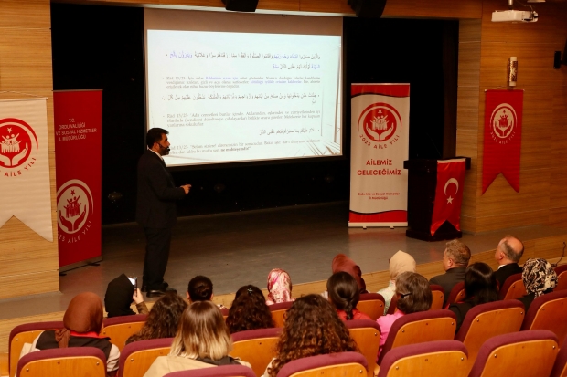İl Müftüsü Dr. İsmail Çiçek, “Kur’anda ve sünnette aile modelleri, Aile Allah’ın bir ayeti, Rasûlüllah’ın bir sünnetidir. Yani evlilik bir ibadettir, Hz. Resul’ün dilinde kadın Allah’ın bir emanetidir. Koca emin, kadın emanettir. Kuranda aile modelleri, Bu bağlamda Kerim Kitap’ta örnek sunulan 12 aile modeline ulaşmamız mümkün görünmektedir. Hz. Adem ve ailesi özelinde mutlu aile örneği ve mutlu olmak için birkaç öneri. İslam’a göre kimdir kadın?, Allah mükâfatta kadın ve erkeği eşit tutmuştur, Uyarırken de eşit davranılmıştır. Her iki cinsten de beklentisi aynıdır, Mutlu ailelerde gönül dili hâkimdir, Mutlu ailelerde değer dili yaygındır, Mutlu ailelerde özür dili geçerlidir, Mutlu ailelerde teşekkür dili eksik edilmez, Mutlu ailelerde bazen sükût diline de ihtiyaç vardır, Mutlu ailelerde dua dili olmazsa olmazdır, Mutlu bir yuva için birkaç tavsiye, Sevgi, Saygı, İletişim ve Yardımlaşma, Beden dilini bilmek söylenemeyeni anlamamıza yarar, İletişim dillerini bilmek daha kolay uzlaşmamızı sağlar, Hz.Nuh ve Lut ailesi özelinde Mutsuz aile örnekleri ve çözüm önerileri, Mutsuz evlilik yaptıklarını düşünenlere öneriler, Evliliği sürdürmenin ilkeleri, Eşimize olan sevgi ve hayranlığımızı geliştirelim, Sorunlarımız esnasında kaçmak yerine yakınlaşalım, konuşalım” başlıklarının yer aldığı bir sunum yaptı.