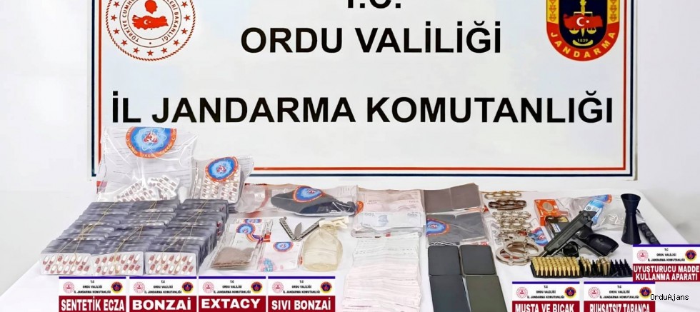 Ordu İl Jandarma Komutanlığı, Ünye Cumhuriyet Başsavcılığı koordinesinde 29 Ocak 2025 tarihinde Ünye ilçesinde büyük bir operasyona imza attı. Operasyon sonucunda, 1.906 adet sentetik ecza, 22 adet Extacy, 36 gram Bonzai hammaddesi, 56 gram Bonzai, 200 ml sıvı Bonzai, 5 gram kubar esrar, 5 gram kenevir tohumu, 5 adet uyuşturucu kullanma aparatı, 1 adet 7.65 mm ruhsatsız tabanca, 69 adet tabanca fişeği, 4 adet muşta, 1 adet sustalı bıçak, 1 adet kelepçe, suçtan elde edilen 36.600 TL ve 9 adet cep telefonu ele geçirildi.